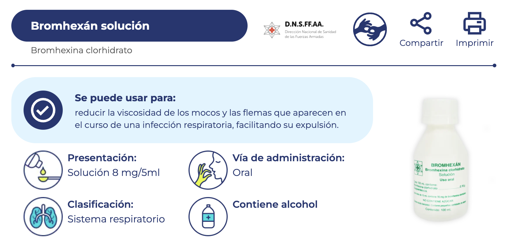 Cada IMA resume la información contenida en el prospecto del medicamento de los laboratorios Dorrego y D.N.S.FF.AA, incluyendo sus principales usos, efectos no buscados, precauciones y situaciones que contraindican su uso. También brinda recomendaciones sobre cómo usarlo adecuadamente y cómo desecharlo cuando ya no se utiliza más o está vencido.